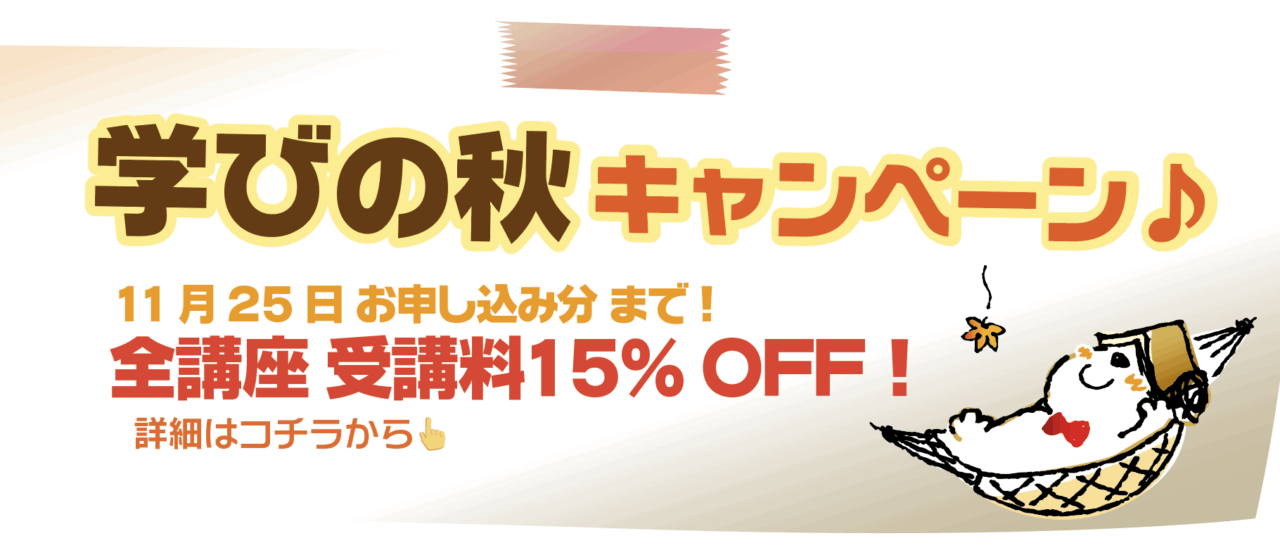 学びの秋キャンペーン2025 投稿日: 2025 投稿者: TPS 11月25日までのお申し込みで 受講料が15%オフ! 年に一度のキャンペーン割引、 気になっていた勉強を始めるなら今! キャンペーン対象:全ての講座 お手続き方法 受講お申し込み後、ご案内されるメールより送金手続きをお願いします。 ・銀行振込の場合:教務部より割引受講料のご案内をいたしますのでお待ちください。 ・クレジットカード払いの場合:メールでご案内する決済サイトでそのままお手続きください。